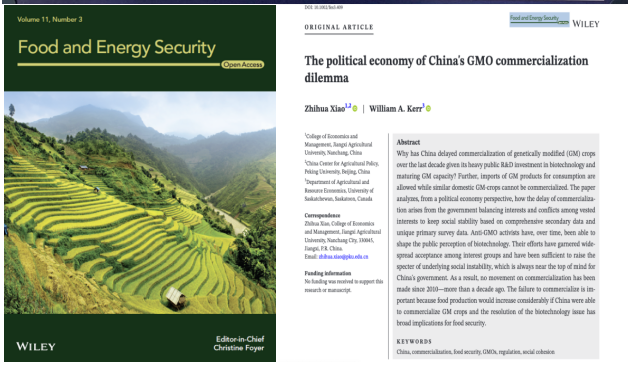 经管学院肖智华副教授作为第一及通讯作者发表在《Food and Energy Security》(中科院, 1Top的文章The Political Economy of China’s GMO Commercialization Dilemma”受到全球学者们的广泛关注,在发表后的三个月内文章的全文下载量在该期刊中国作者2022年第三季度中排名第一。肖智华因此获得Wiley威力中国开放科学高贡献作者”奖,这是公司教师首次获得该奖项。