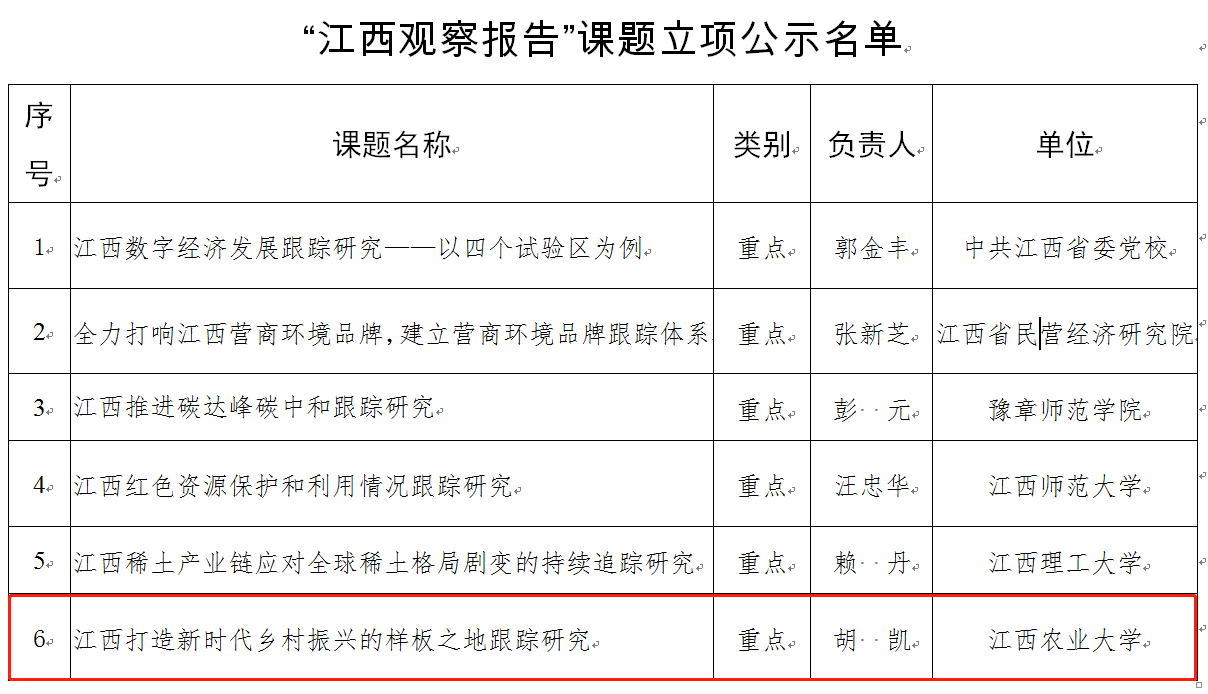近日,江西省社会科学界联合会公示2022年度“江西观察报告”课题立项名单,BB贝博艾弗森胡凯教授申报的课题“江西打造新时代乡村振兴的样板之地跟踪研究”喜获立项,被列为省社科基金重点项目;该研究将对乡村振兴样本之地进行跟踪研究,总结与提炼出样本之地取得成功的经验与发展路径,为其他村庄发展提供借鉴,也为江西乡村振兴贡献江农智慧。
