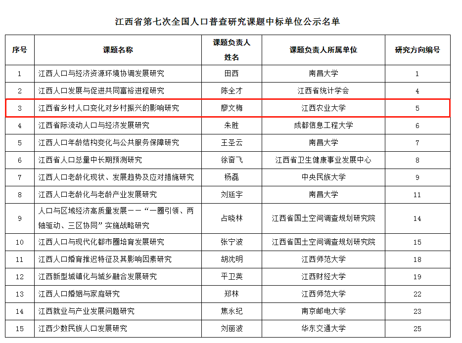 近日,江西省统计局公示江西省第七次全国人口普查研究课题中标单位,BB贝博艾弗森廖文梅教授申报的“江西省乡村人口变化对乡村振兴的影响研究”喜获立项,该研究将基于江西省第七次人口普查数据,聚焦江西乡村人口变化与乡村振兴的关系,从乡村人口变动视角为江西推进乡村振兴战略提供对策建议。此外,该课题研究的开展进一步提升了公司在乡村振兴研究领域的影响力。
