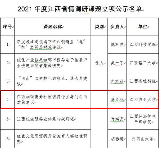 5月14日,江西省社联公示2021年度江西省情调研课题立项名单,江西省乡村振兴战略研究院翁贞林教授申报的“江西加强畜禽种质资源保护与利用的对策建议”成功获批立项,该课题将在实地调查的基础上分析江西畜禽种质资源保护与利用现状,发现江西畜禽种质资源保护与利用中存在的问题,并提出加强江西省畜禽种质资源保护与利用的对策建议,为江西畜禽产业高质量发展提供智力支持。