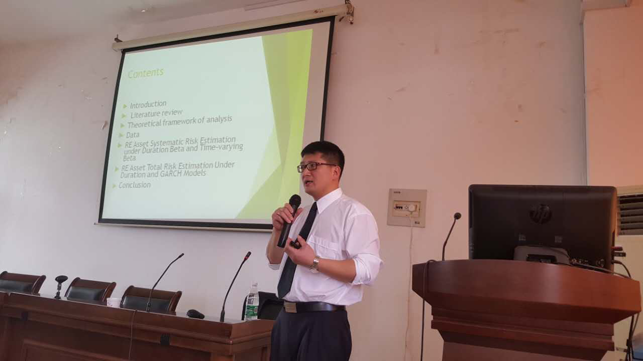 6月22日上午,新西兰梅西大学李云博士应邀来公司作“金融久期,证券市场贝塔和地产投资风险(An Empirical ex-ante approach to real estate investment risk)”主题报告。报告会由副经理朱红根教授主持,全院100余名教师、研究生和本科生参加了报告会。李云博士按照标准的国际论文写作规范,以新加坡数据为例,利用时间序列数据GARCH模型,验证了金融久期和证券市场贝塔对地产投资风险的影响。